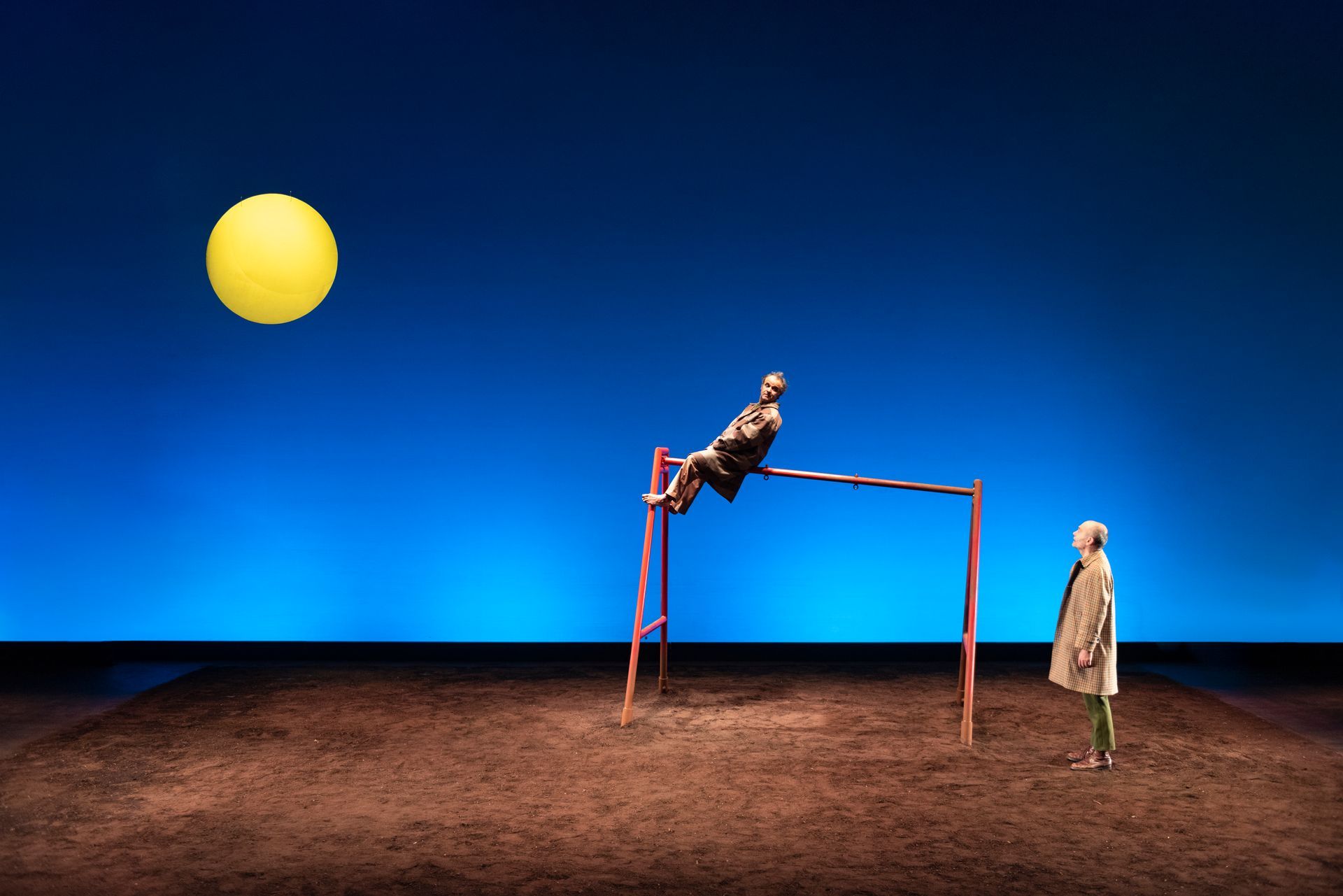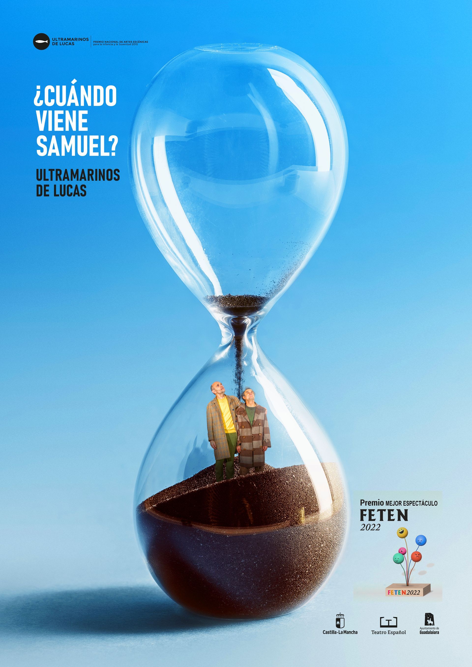 Dos hombres esperan junto a un columpio la llegada de Samuel para celebrar una fiesta. Pasa por allí el señor profesor, les da la lección y se marcha. El tiempo pasa, no deja de pasar, no termina nunca de pasar, nunca... Jugando, esperan otro día más. ¿Y si hoy ya fuera mañana? Subidos al columpio, tal vez puedan escapar.