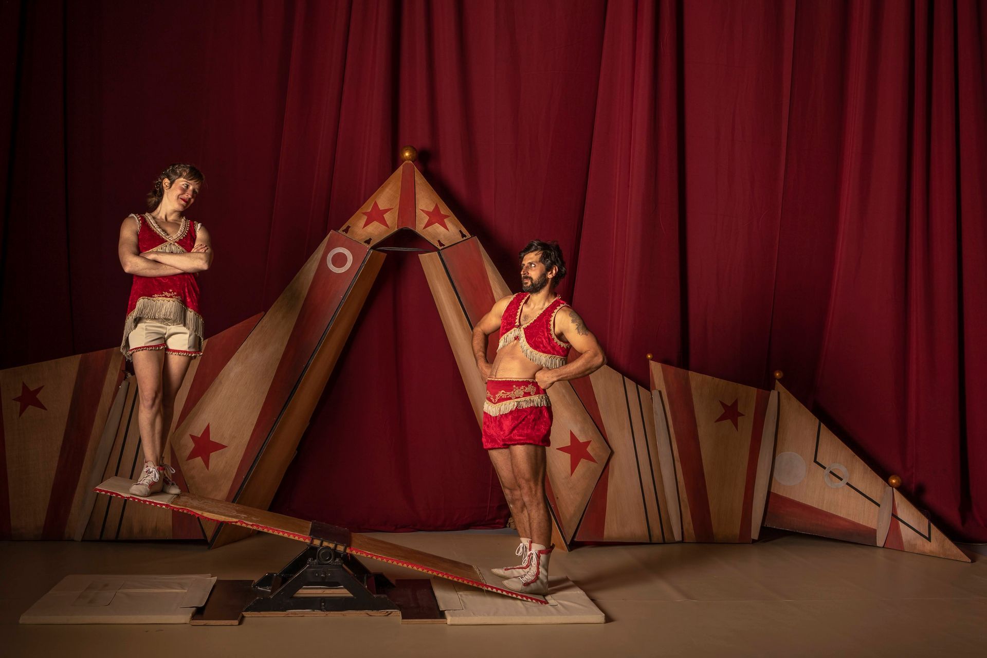 Un dúo de acróbatas y padres primerizos nos presentan un show de báscula y portes acrobáticos donde veremos saltos frenéticos y agarres de último momento. Faltan 5 minutos para que empiece la función, pero la babysitter no aparece. No hay más alternativa: el espectáculo tiene que comenzar, y el bebé les acompañará. Agarran el carrito y salen a la pista.