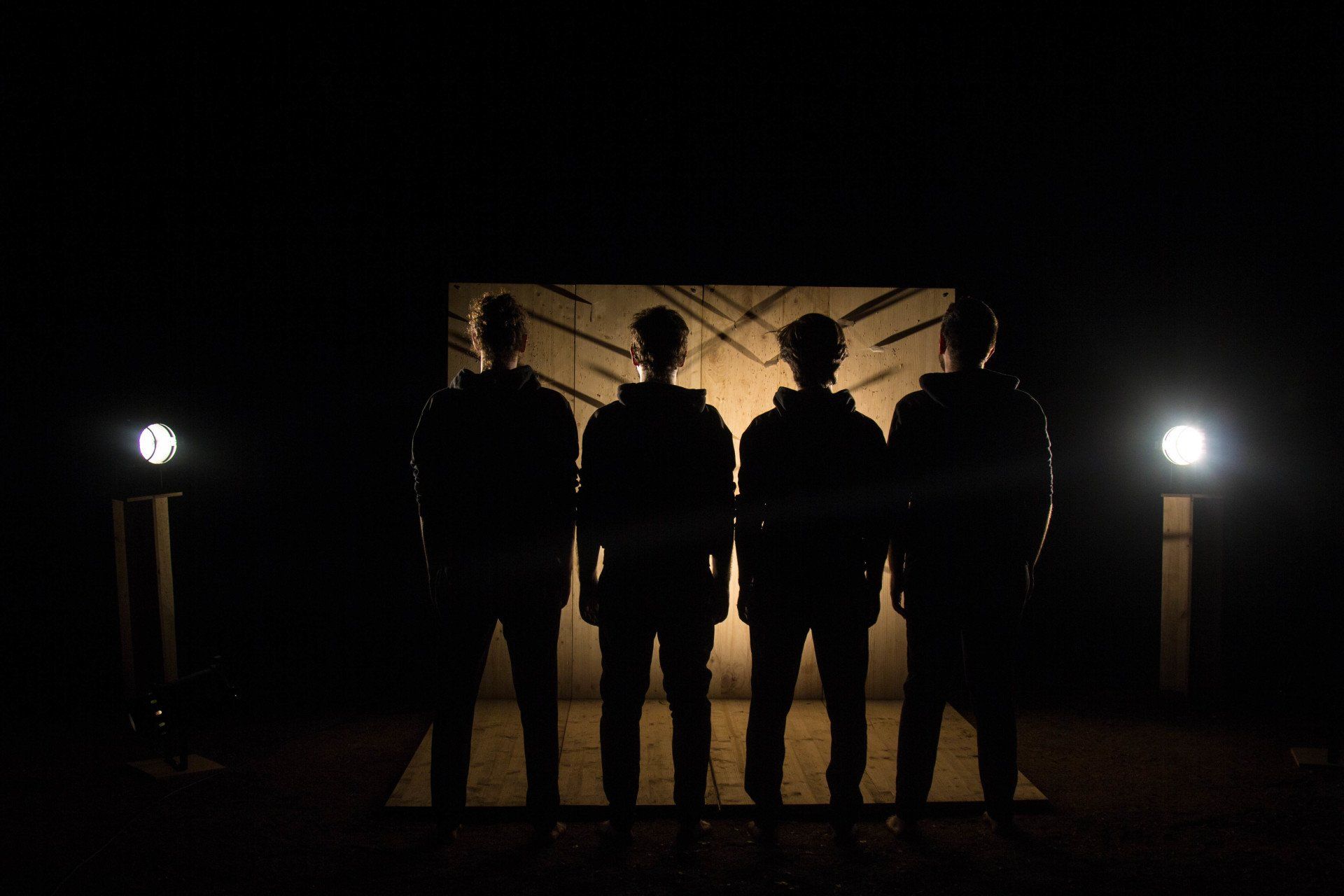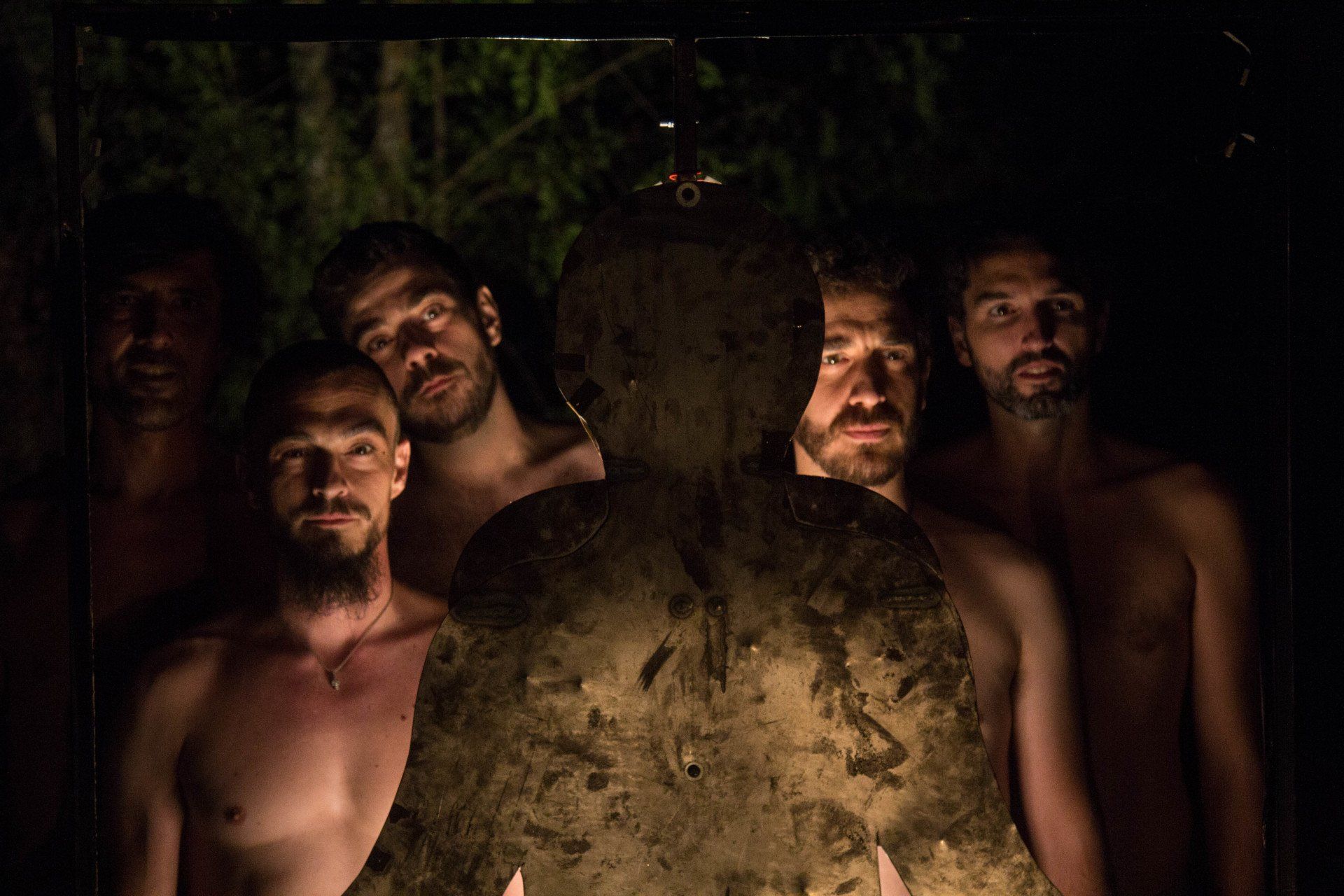 Veremos en escena a cinco hombres. Cuatro de ellos son intérpretes, malabaristas, manipuladores de objetos que en su movimiento hacen flotar pelotas, imantan mazas y lanzan cuchillos. Un quinto se mimetiza en la mecánica lumínica, un metatécnico, el manipulador de la luz, que carga con lámparas, ilumina la escena, proyecta imágenes e invita al público a acompañarle en la iluminación del show mediante linternas.